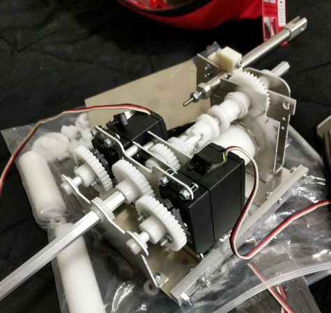 I'll admit, I got pretty ambitious with how many of the scoring elements I wanted to take a crack at. I quickly realized that if I wanted to get a faster robot I had to give my drive train at least half of my motors. That only left me three motors to yank a 6lb weight, collect a bunch of rocks, and raise them up a few feet (and all in under two minutes or so). My solution? I made a transmission with the remainder of my motors (first one with 2, then upgraded to 3). It was pnuematically actuated, included some handmade dog gears, and was strong enough to take a finger.
