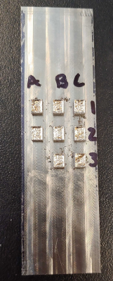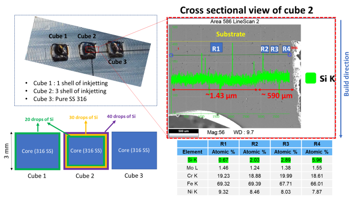 I ran out of time in my masters to fully characterize and troubleshoot the system. The main things left are fully characterizing what print parameters are needed to actually get reliable results with the hybrid inkjet-SLM approach and fully testing/tuning the bed heating system. Otherwise I was able to do a small parameter sweep with 316L stainless, and was able to demonstrate a controlled gradient print (thank you to Emre Tekoglu for the EDX analysis below). I got lazy with the scale bars but the small cubes shown below are about 4x6x3mm (WxLxH) (left) and 3x3x1mm (right).