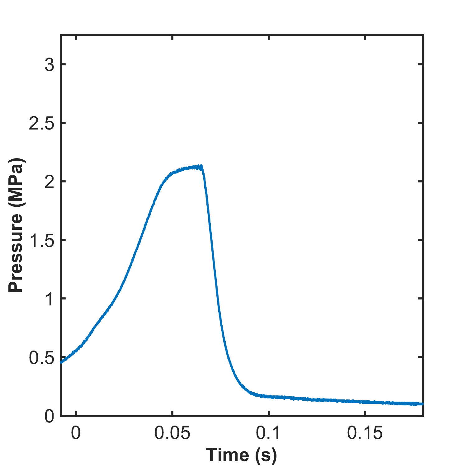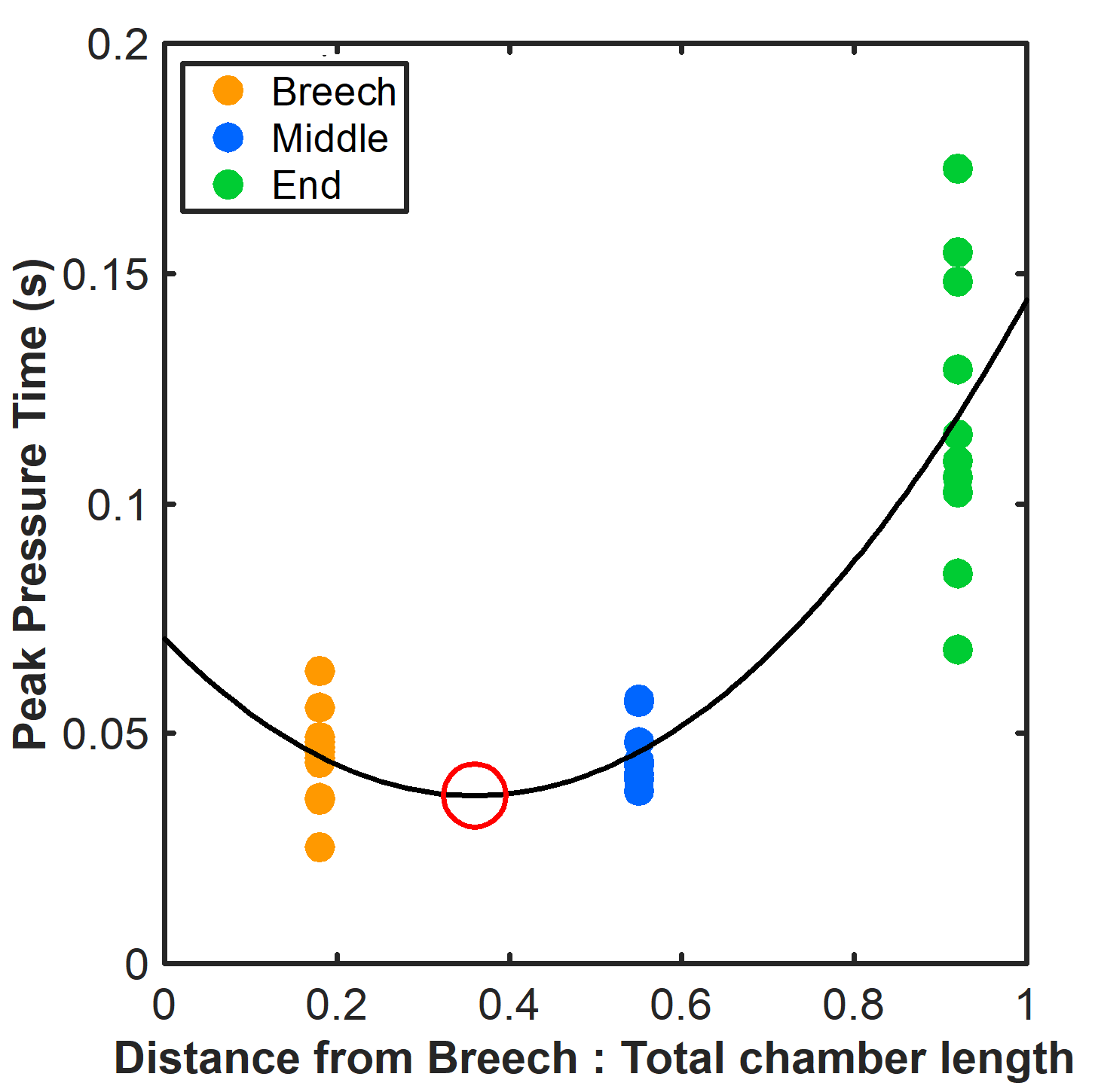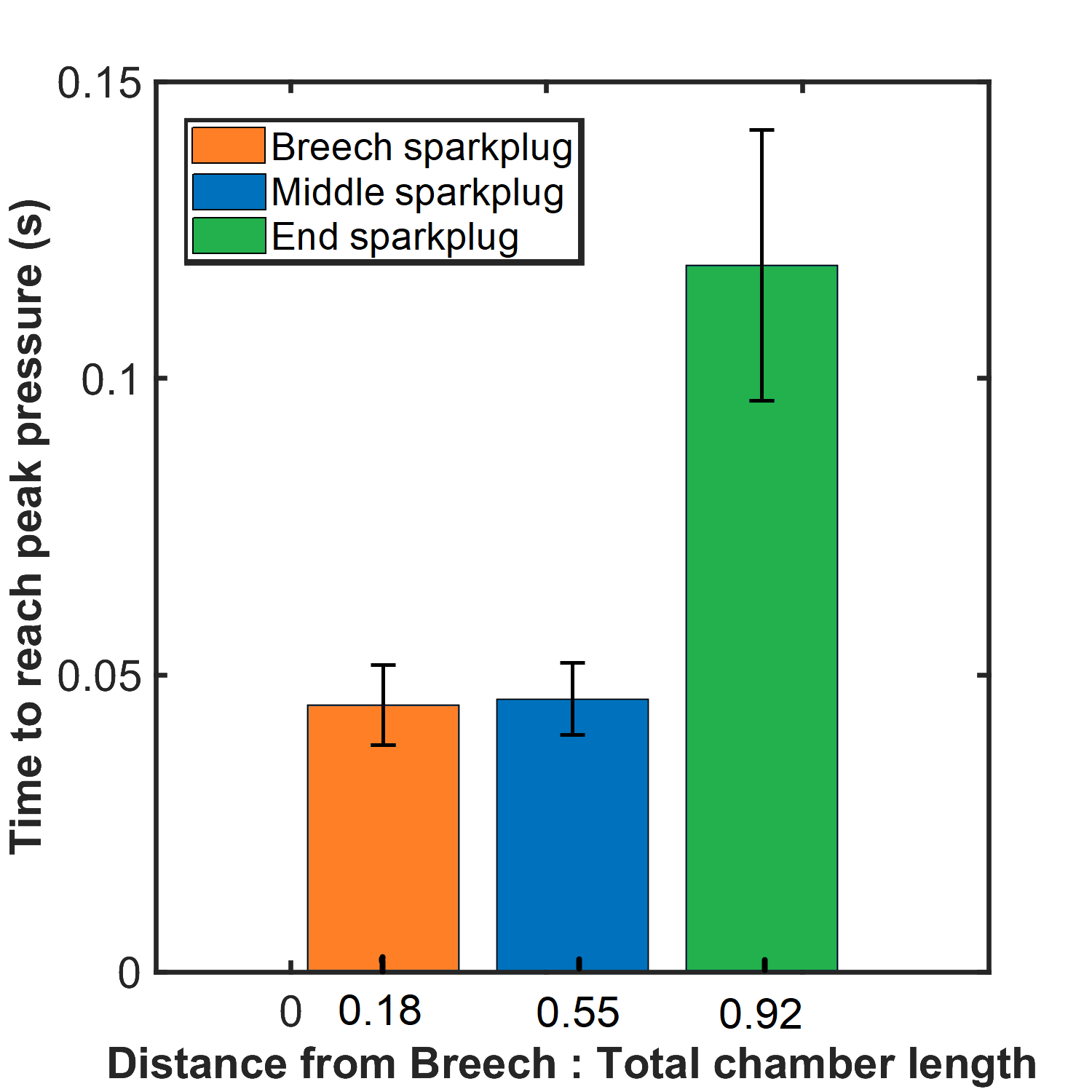 The left most graph shows a sample of the pressure transducer's output over time, the middle the mean times to reach peak chamber pressure, and the right a quadratic fit of the data. I hypothesized that the fastest peak pressure time would be seen at the centroid of the chamber since there would be two flame fronts propagating an equal, minimized distance if they originated at this point. It's interesting to note that the mean peak pressure time was NOT in the centroid of the chamber but actually shifted from it, possibly indicating some more significant reliance on the chamber's morphology than simply finding its centroid (i.e. that the bend/elbow in the chamber affected the flame propagation speed).