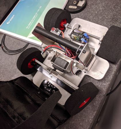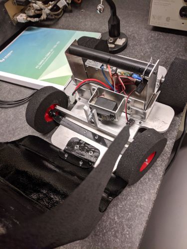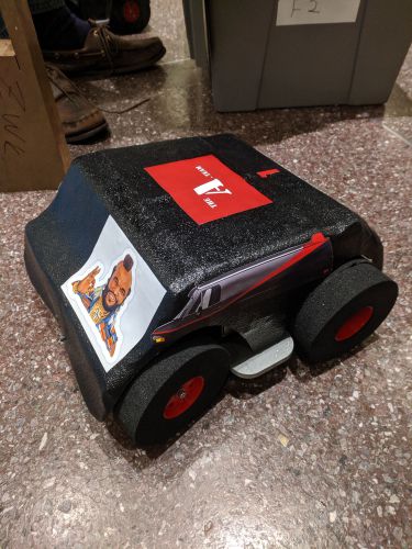 During the actual race component of the course we happened to strip a lot of our gears (we definitely didn't design the power train to be very robust), but until that point we were contenders for first place. The control box containing the battery, reciever, and steering servo was also made to be easily swapped between cars (since we had to swap out cars every lap).