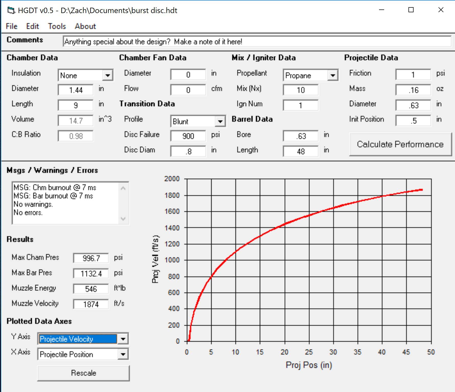 I also made another hybrid style cannon on a smaller scale that utilized a rupture disc instead of a piston valve. With the disc and butane/air mix a fairly precise chamber pressure can be achieved as well as predictable velocities/muzzle energies (with a marble the muzzle velocity tends to top out at around 1800ft/s).