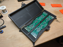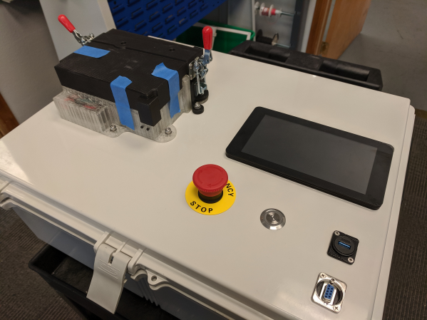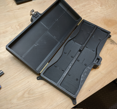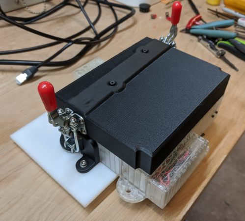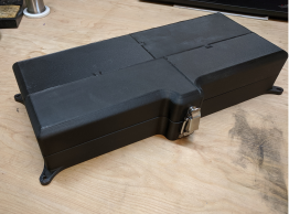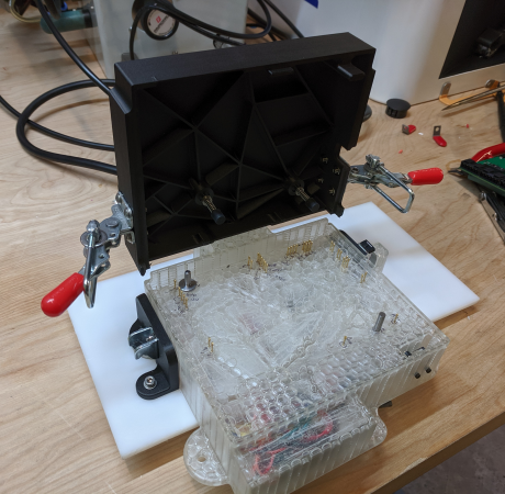 The boards for controlling the battery also required a testing and programming enclosure that was completely closed in to prevent electrocution of the user. This turned out to be a simple box with some integrated cabling/mounts, a limit switch, and a latch. The interesting part is that it had to be printed in 8 pieces.