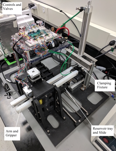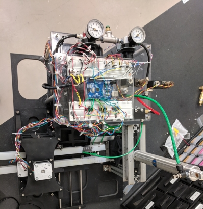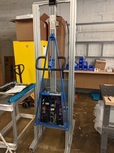 After doing some testing and revisions of the structural components, I arrived at the design shown to the right and below. It has two lead screws to drive the lift and tray, a rack and pinion for the arm, and two air cylinders for clamping and advancing the bag into the CTS instrument for pressure decay leak testing. I also put together the control/power circuitry and programmed it with an Arduino.