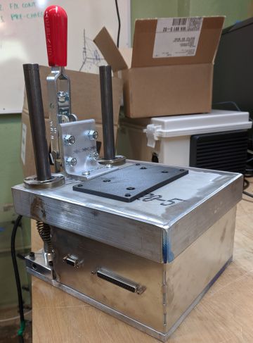 I also got to help build up a piece of production equipment centered around testing, calibrating, and programming the BMS PCBs. I designed and made a bed of nails to sandwich the boards onto some spring loaded contacts and to completely isolate the user from the board. Given that there would be 400V going to the board during calibration and testing, there are toggle clamps and an integrated limit switch to ensure the test can't run while the operator is potentially exposed to high voltage. I also took a stab at writing some code to control the onboard power supply but the actual software engineer came back from vacation before I could finish it (it was originally his project).