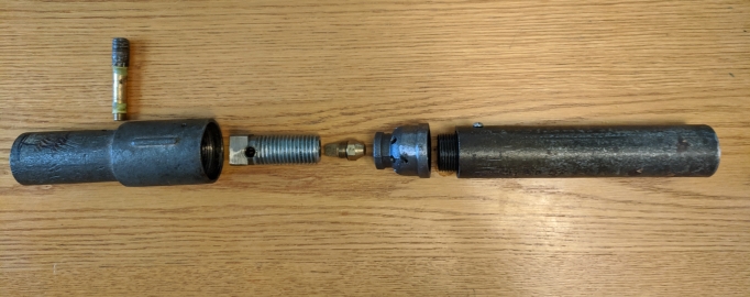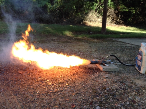 Delavan nozzles are a type of pumped oil nozzle, where the oil is atomized not directly through interaction with pressurized air but by its own centrifugal forces as it's forced through the nozzle. This frees me from having to hook up a large compressed air source, which is pretty nice. The only problem is that the massive amount of oil I obtained came from these amateur stock car racers who slopped in all sorts of additives into an already high viscocity oil. The resulting sludge only managed to clog my poor nozzle.