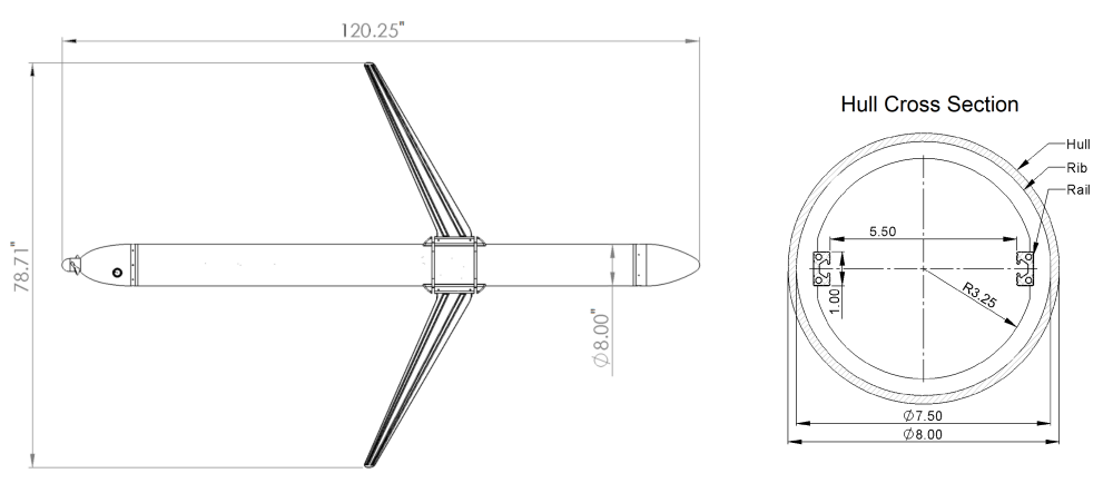 The wingspan is about 6 feet, with a 10 foot length and 8 inch outer diameter. It also only weighs about 175 pounds, and the wings are easily removable for either replacement or for ease of transporation/storage/deployment. This tighter packaging was sought to eliminate the large overhead involved with deploying and recovering large vessels. The usable inner diameter of the hull is cut down to between 5.5-6.5 inches with the ribbing and rails.