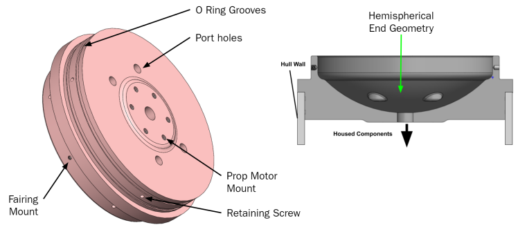 To make room in the fairings for the bladder, snorkel, and propeller components we made the end caps an inverted hemisphere, which still distributes the load well enough to reduce sharp stress concentrations at the ends. They also look a little like swiss cheese due to all of the inlet and outlet ports going to the sensor package and the buoyancy engine/fuel tank.