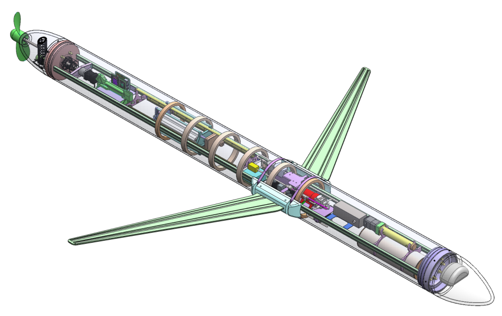 I was the lead for the structures subteam, responsible for designing the hull and packaging/assembly of the interior components. After a couple of months of researching, designing, and reviewing, we came up with the Long Endurance 1000m-rated Deep Ocean Underwater Glider, affectionately Dubbed DOUG LE-1000.