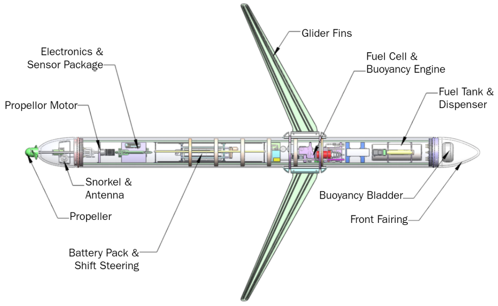 The overall design is fairly complicated and you can read more about it in our hastily written white paper . It includes a main buoyancy engine, and smaller trimming engine, a propeller, and glider wings to suit a variety of movement functionalities and use cases. To meet the 30 day continuous mission time while still maintaining a light and slim overall profile we looked into using aluminum as our principle fuel source. As it turns out aluminum reacts with water to produce hydrogen, though normally the oxide layer inhibits this. If you alloy it with some gallium and other metals it reacts much more readily though. The hydrogen produced goes to inflating the main buoyancy engine in the front of the vehicle, and once the vessel rises to the surface it's used by a PEM cell to recharge a small pack of batteries. There's also a collapsable snorkel to raise an antenna for iridium communications, GPS, and air line. There's also some pretty innovative navigation, communications, and automated swarming tech built into it.