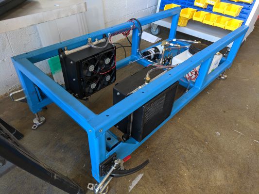 One of my main projects was to make an end-of-line dynamometer for fully built outboards. Prior to this unit there was no real means to verify the complete outboard without installing it on a boat and putting around a lake for a while. It utilizes one of PWC's motors and controllers as an electronic load for the unit under test and is meant to lock said test unit in place while it's on its modified engine stand (not pictured). I designed most of the mechanical elements (short of the driveshaft and absorber block), the cooling system, and the control circuitry while outsourcing the control software. I also performed a lot of analysis to ensure it could mate with the outboard getting tested and wouldn't blow up unexpectedly. Due to a long list of complications with our supply chain I did not get to finish the project, but handed it off at the point where it was ready for final assembly and troubleshooting.