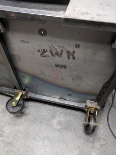 The cart itself is an absolute unit, designed and handmade (mostly) by yours truly. The top work surface is a half inch thick slab of AR500 plate topped off with a layer of stainless steel sheet. The rest of the cart is all steel tubing and sheet metal thick enough to make an industrial sheet metal brake cry a little.