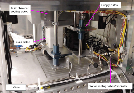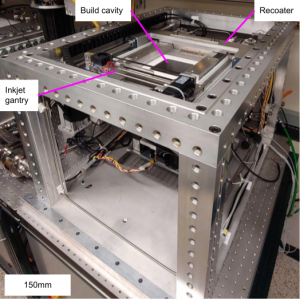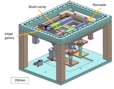 Aside from getting HAMR2 operational, I also worked on designing and developing another SLM system with a couple of key characteristics. The printer was to be a sort of hybrid setup with an inkjet printer included in order to enable printing compositional gradients. The system (dubbed HAMR3) was also meant to print newly developed refractory alloys (namely of niobium). In order to avoid the cracking and defects associated with those alloys, the build volume of the printer needed to be maintained between 500-600C.
