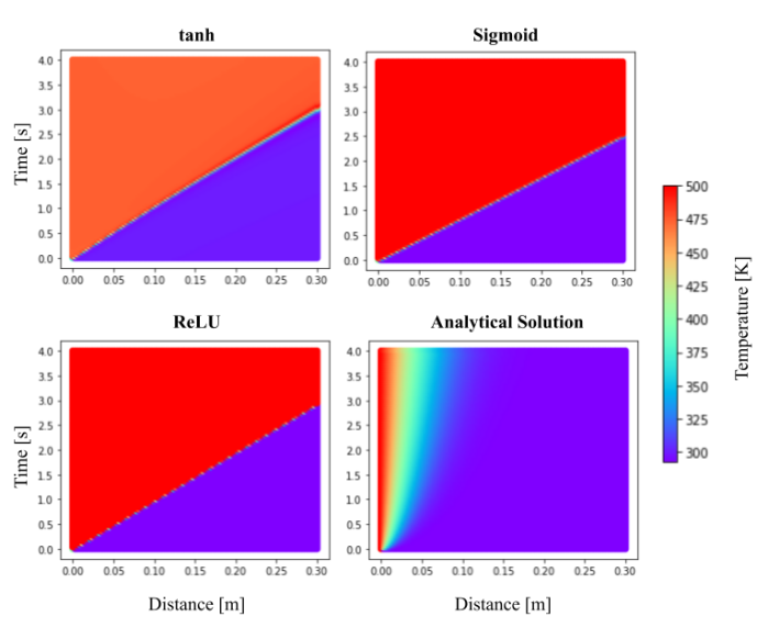I tried manipulating a handful of network/model parameters to get the output closer to the analytical solution. Above is the sorry results after trying a few different activation functions.