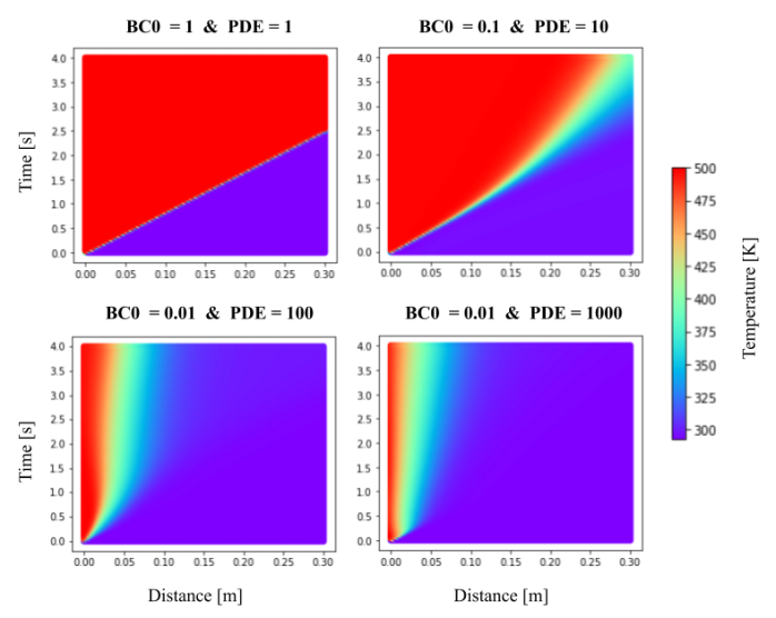 After screwing around for a while, I figured out that I could attenuate portions of the output via their loss functions. Much of the previous results showed no real gradient and drastically overestimated temperatures, so I tried weighting the overall PDE loss more and the x=0 boundary condition loss (BC0) less. The network output quickly approached the analytical model.