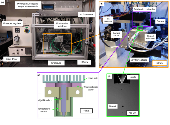 Since we would be jetting on top of a very hot surface, I built a separate test stand for the inkjet printhead alone and to characterize its interaction with a heated surface. The setup includes the printhead, heated surface (on a set of XY servos), all of the supporting electronics, and a high speed camera to view the interaction. The printhead itself is designed with a thermoelectric cooler such that the inkjet nozzle's temperature is controllable, and a stainless steel cover should shield the nozzle orifice from most of the thermal radiation from the substrate.