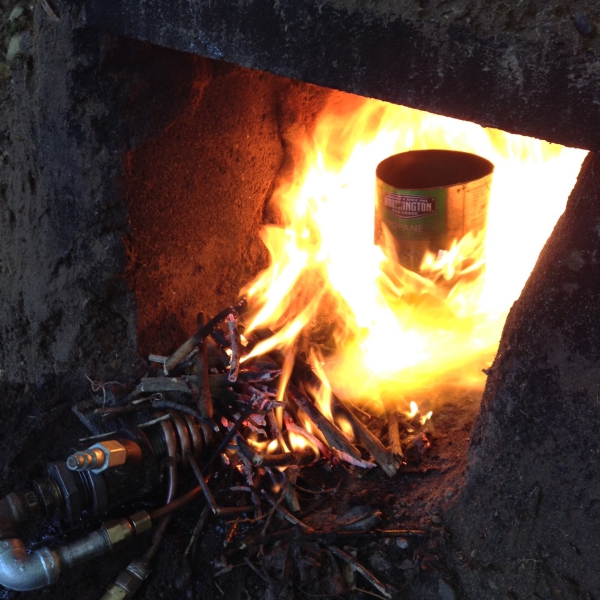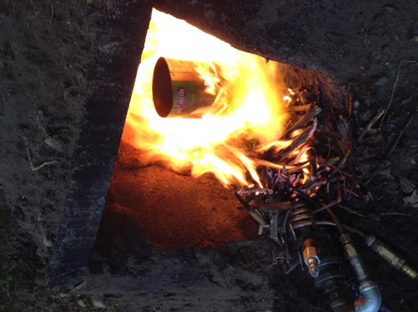 Another energy source I looked into for a while was used motor oil, which, thanks to a well-placed ad on craigslist, I had obtained 50 gallons of. I initially tried dripping the oil into an airstream to atomize it, but I couldn’t get that to work. At some point I tried vaporizing the oil and pressurizing it but that didn’t work at all. After that I tried pressurizing the oil and just combining the oil and air lines in a junction right before the nozzle, which turned out to work for the most part. For the furnace itself I basically dug a hole in the ground and lined it with cinder blocks and bricks that I had lying around. The largest melt I attempted in my makeshift pit was about 10lbs of aluminum, though the entire apparatus supporting the pressurized oil and air rig is very cumbersome.