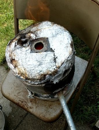 The first forge I made was casted using a furnace cement and perlite mixture. Perlite is basically just expanded rock/mineral, so it's a very cheap high temperature insulator. The oven itself cracked pretty easily and was not very robust, though it was very portable (I could load the whole thing + propane in my trunk) and was pretty quick to use. The price of propane was starting to eat my paltry budget though so I started looking for alternatives pretty soon.