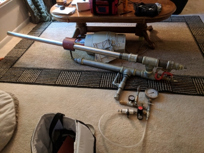 The piston valve hybrid cannon was a concept I saw on YouTube a few years ago and always wanted to build. It replaces the rupture disc normally used in ‘hybrid’ cannons with a piston to more finely tune the opening pressure of the chamber. I haven’t actually gotten a chance to mess around with it too much but its theoretical maximum velocity is around 1500ft/s with a standard golf ball.