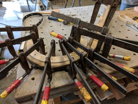 I've taken some dives into furniture making, that said my table was made more to survive a nuclear blast than coffee cups. The rightmost picture is probably the coolest, it turns out that if you saturate a piece of wood with hot steam you can bend it to whatever shape you want!